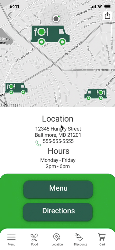 I suggested we name the application "Rolling Oasis" to represent a food truck oasis in a food desert, and designed the logo to include a bright horizon to reflect that concept. I chose a clean design, with vivid imagery and inspirational colors that reflect healthy eating, and delicious food that would be appealing to our user base. The design was incorporated in a high-fidelity prototype which was tested with users for validation of our concept and usability feedback.